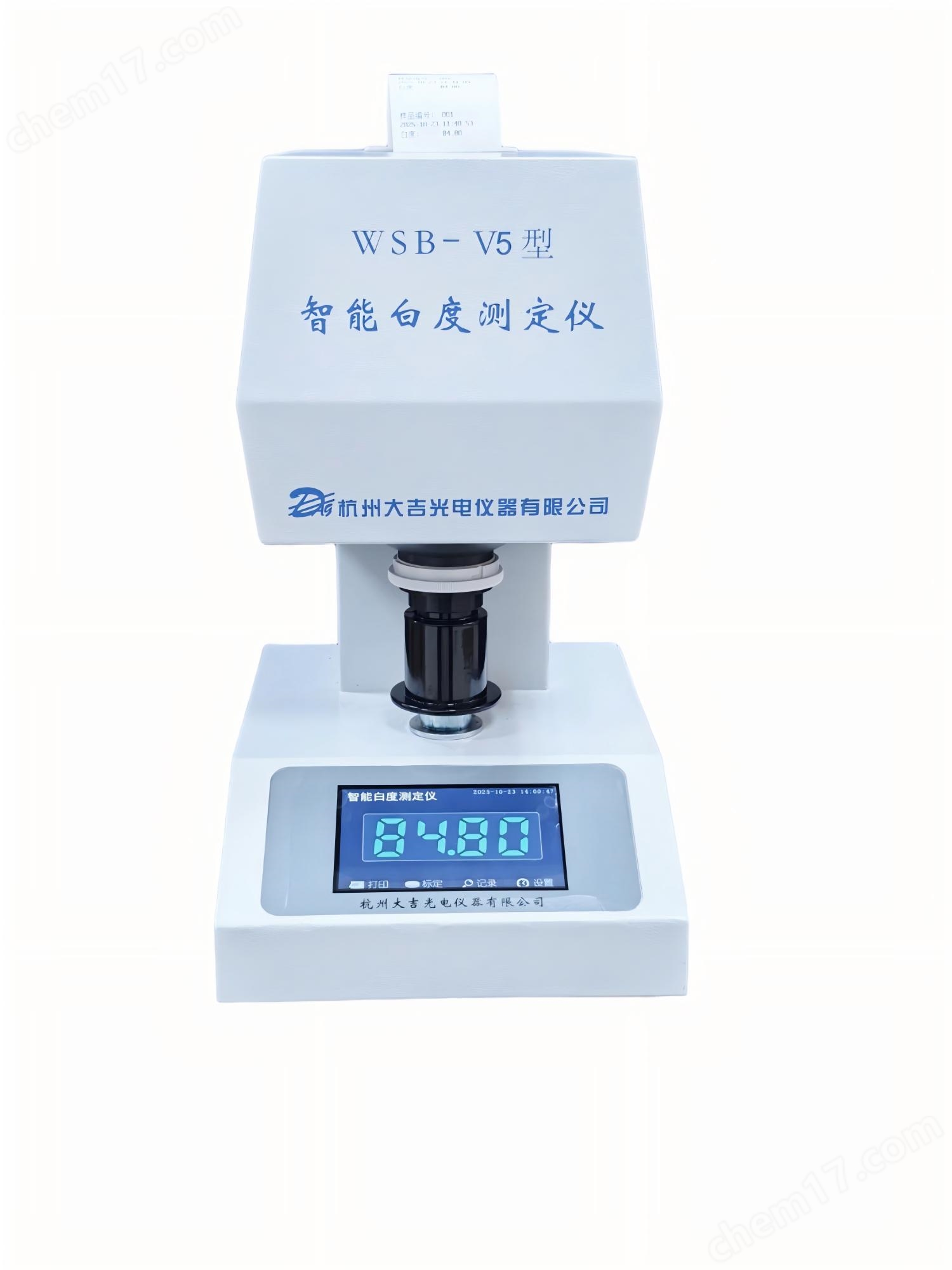 新款WSB-V5全彩触摸大屏全自动智能白度测定仪开机自动校准,无需等待可摒弃白板黑桶,直接测量白度,显示精度0.01,高精度,具有数据超长稳定时间,微电脑配置,中文操作界面。彩色触摸显示屏,可以同时显示时钟、参数、数据、状态提示符等内容;配有高精度微功耗芯片、大容量内存。配有TYPE-C接口可连接电脑,配内置低功耗热敏打印机;系统设置有亮度调节、时间设置、语言设置、自动恢复等功能,设有数据保存、数据查询、数据打印等功能,可存储大于4万组以上的测量数据,具有掉电保存功能;可靠的进口长寿命光源,优化波长,定位结构及独立多光路检测系统,可有效避免杂散光引起的干扰,能准确测定;可靠的活动平台设计,可以有效避免测量孔口漏光现象.简单操作,采用中国计量院标定的标准白板来传递白度标准值,该仪器用于测量物体表体蓝光白度,测量数据准确可靠;本仪器符合《JJG512-2021白度计计量检定规程》中“标准级”白度计的计量要求,确保在面粉、淀粉、米粉、食盐、纺织品、印染、化纤、塑料、瓷土、滑石粉、碳酸钙、矿粉、涂料、油漆、陶瓷、搪瓷、纸张、纸浆等多材质检测中,数据偏差始终控制在行业居先的范围内。